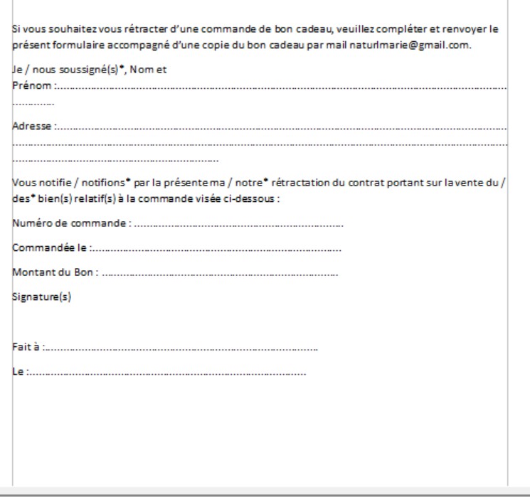 remboursement doit s’effectuer de la manière suivante : Effectuer une demande grâce au formulaire de contact (www.marie-laurendeau-puaud.fr/). Après vérification de la non-conformité du chèque cadeau, des produits il vous sera remboursé.